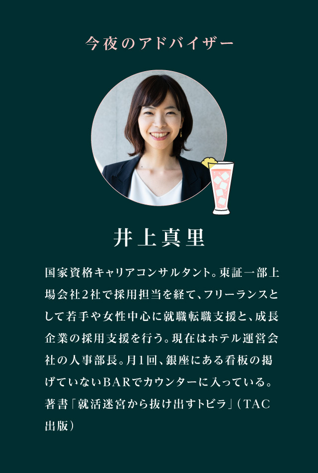 カウンター越しに会話のお相手をするのは、キャリアアドバイザーの井上真里さん。