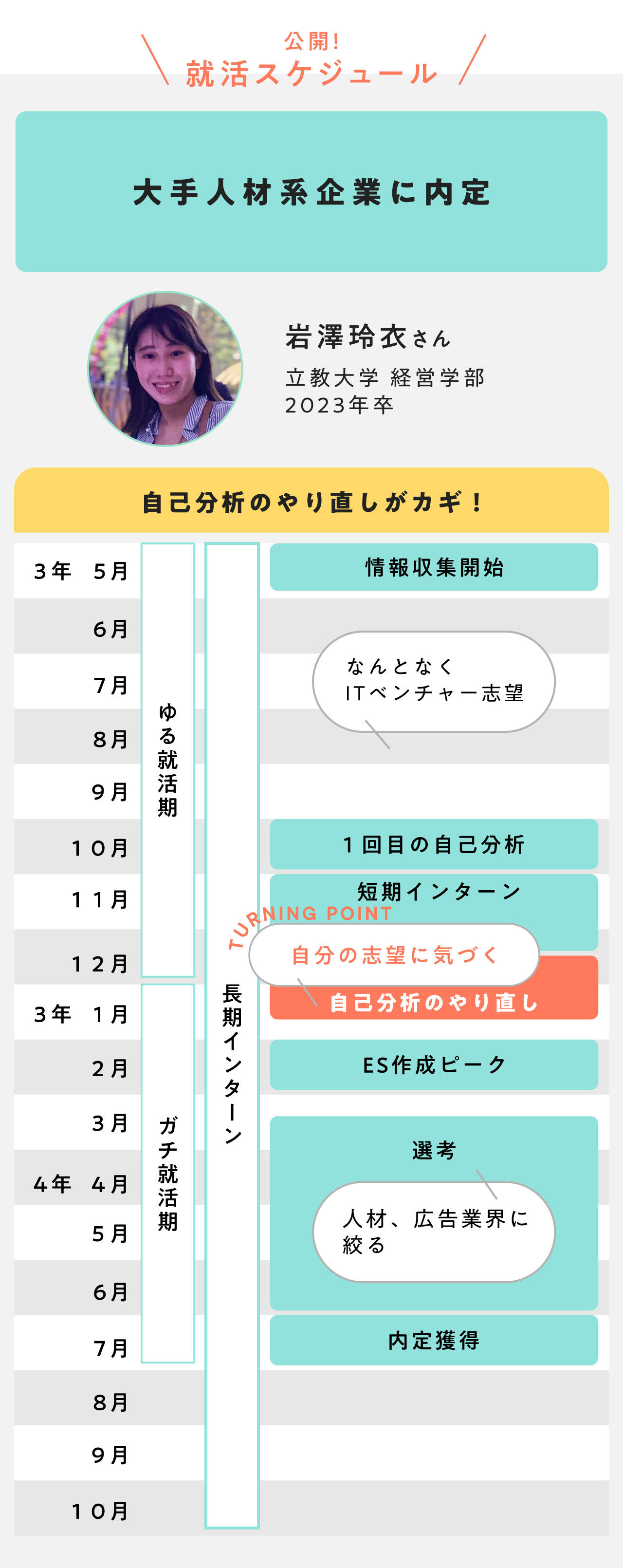3年生の12月は「自分史づくり」に充て、年明け1月からは人材業界、広告業界に絞ることにしました。そのタイミングで、ITベンチャーを新たに受けるのはやめました。