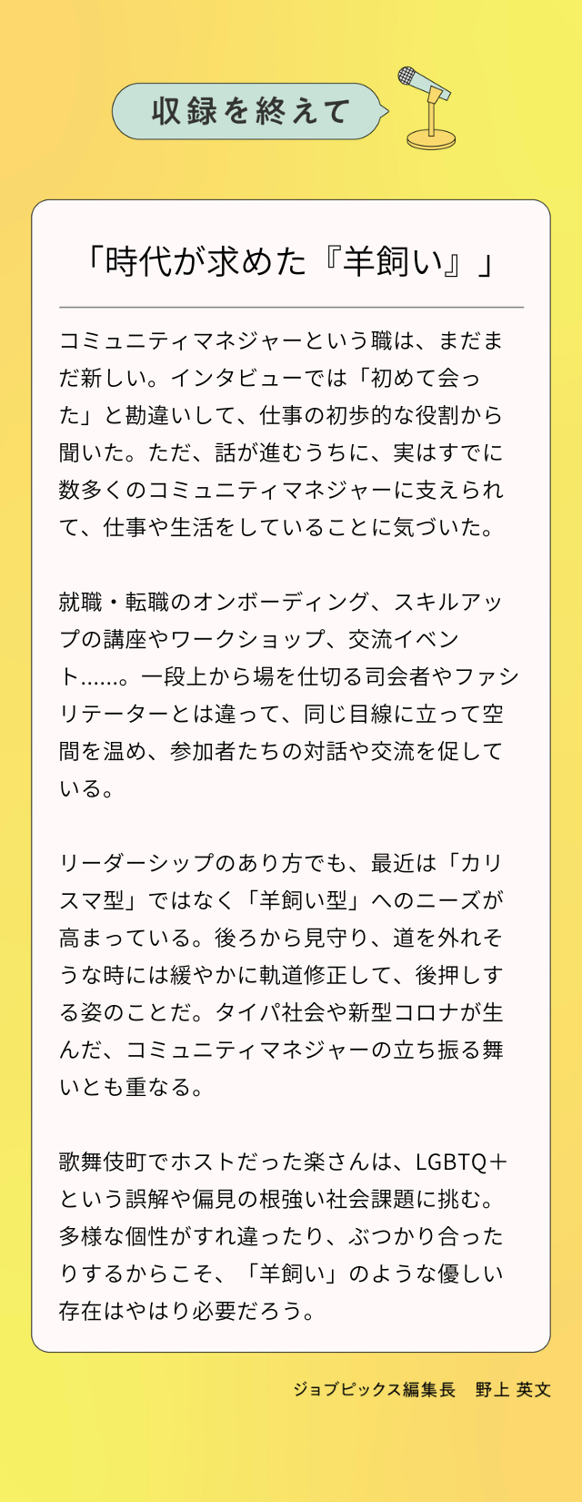 「コミュニティマネジャー」という言葉がなかった時代にも、常連さんが多い飲食店を営むように、そういう感覚や仕事自体は存在したと思います。 ーーどういう役割が期待されていますか?