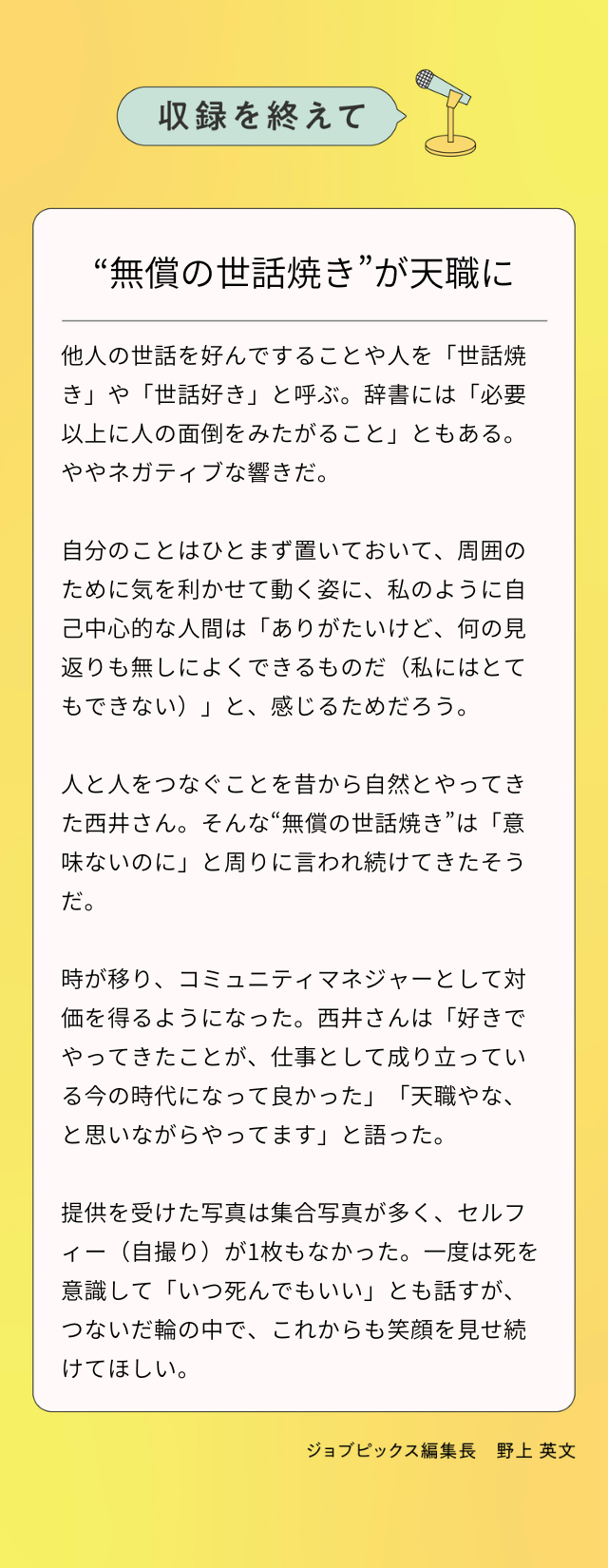 西井:いえ、初対面の人としゃべったり、人をつないだりすることそのものが元々好きなので、コミュニティマネジャーは私にとって“天職”だと思いながらやっています。