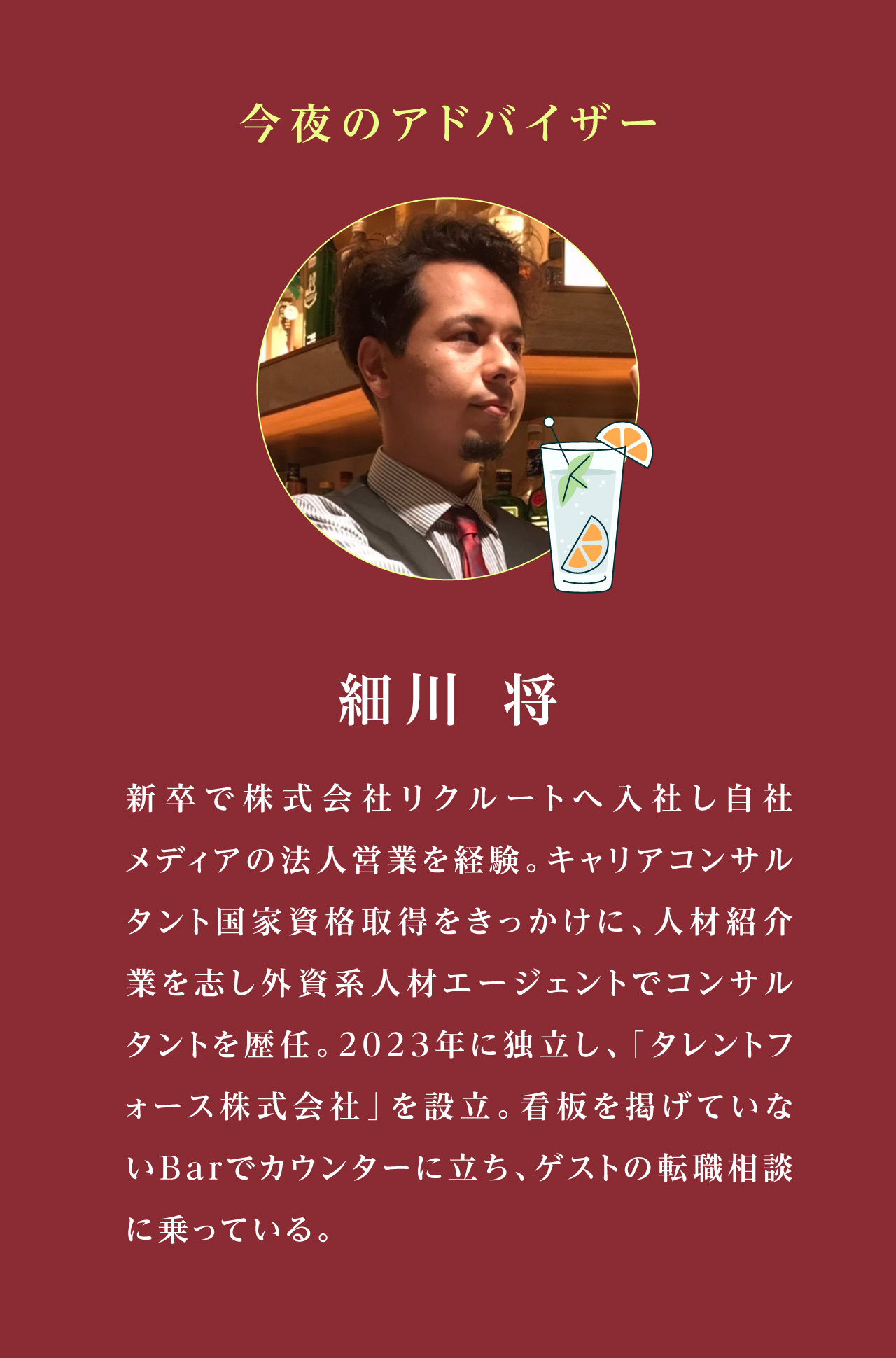 今夜、BARでアドバイザーとして席に座るのは、採用コンサルティングや人材紹介事業をする会社「タレントフォース」を創業した細川将さん。定期的にBARのカウンターに立ち、転職やキャリアの相談に応じています。
