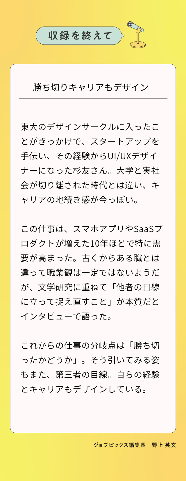 今回注目したジョブ(職)は「UI/UXデザイナー」。BtoBプロダクトのUI/UXデザイナーである杉友さんに話を聞きました。冒頭はUIデザインとUXデザインの目的を教えてもらいました。