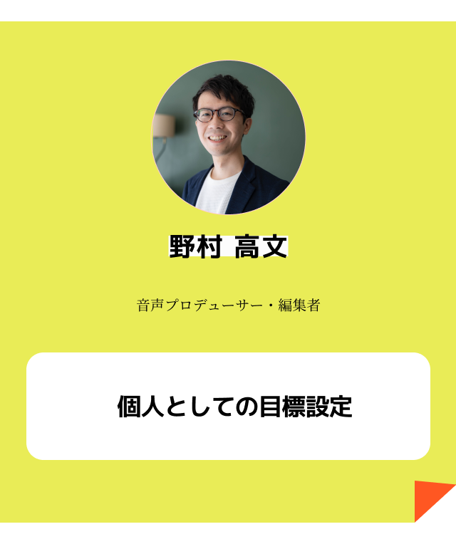 さまざまなPodcast番組のプロデュースや編集に関わる音声プロデューサー・編集者の野村高文さんがイチオシするのは「個人の目標設定」。これは上司から言われたものや会社で必要なものではなく「個人としてやりたいこと」に力点を置くことを強調します。