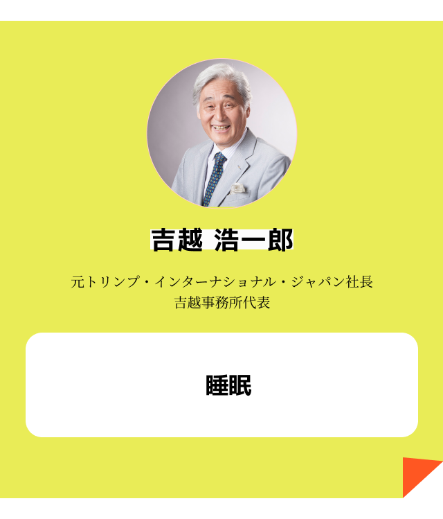 吉越「十分に寝た後の、自分の『頭の良さとキレ』は忘れないで。そして会社のためにも自分のためにも、毎日十分に睡眠を取った状態で出社できるよう努力してみては。周りのみんながあっと驚くような、誰にも負けない仕事につながるはずです。正月はせっかくのチャンスですから、十分な睡眠を取り、これを機会に私の実践してきた『残業ゼロ』を狙ってほしいです」