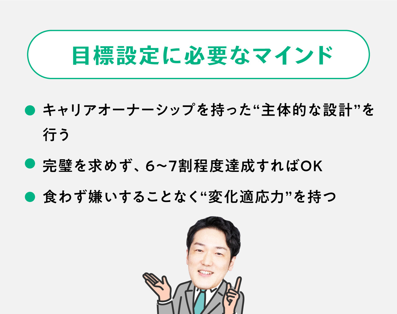 特に会社員であれば先にお伝えした通り、仕事は会社都合で変化するでしょうし、ポジションが変われば達成すべきことも変わるはずです。だからこそ食わず嫌いすることなく、変化適応力を持ちながら、「ある程度、自分の狙った方向性として進んで入ればOK」という意識が必要です。
