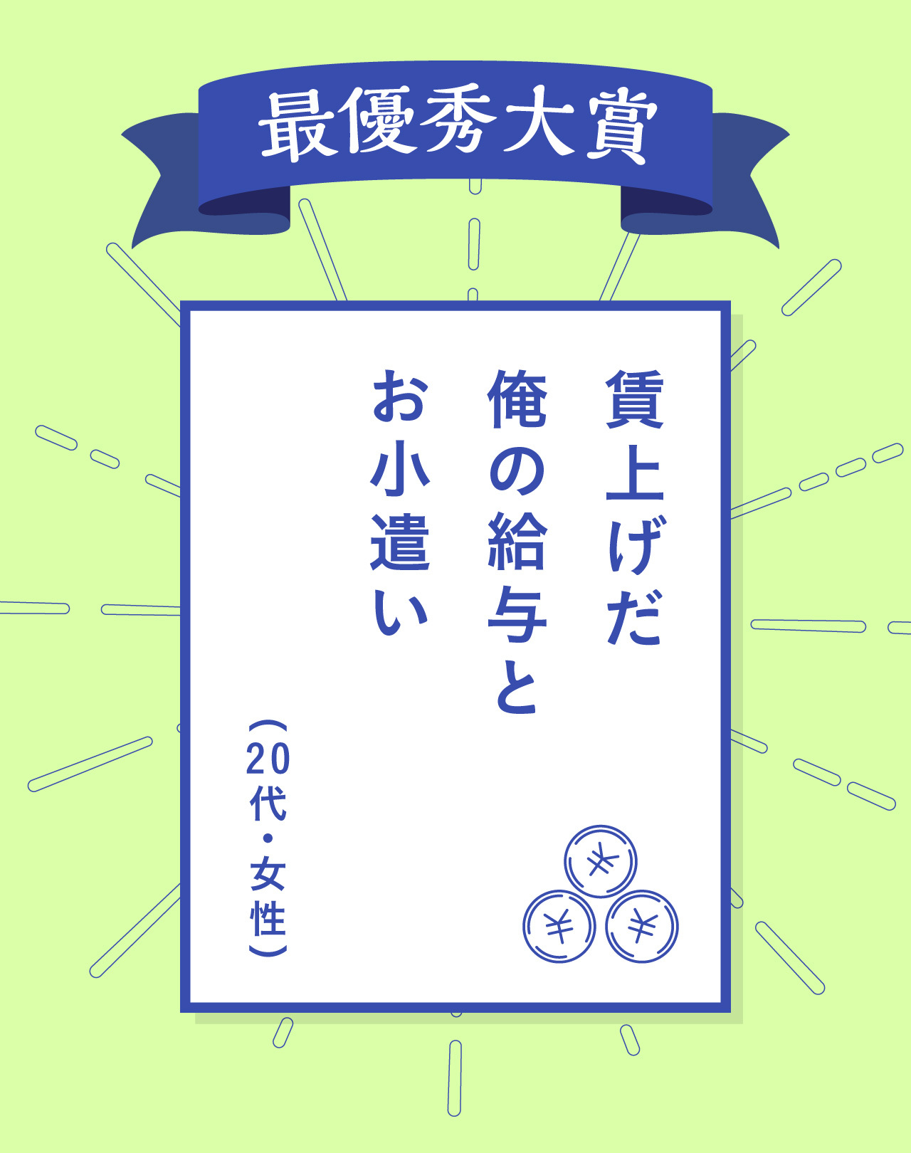 最優秀大賞に選ばれた作品「賃上げ 俺の給与と お小遣い」は、「賃上げ」に喜ぶ様子が目に浮かぶ一句でした。
