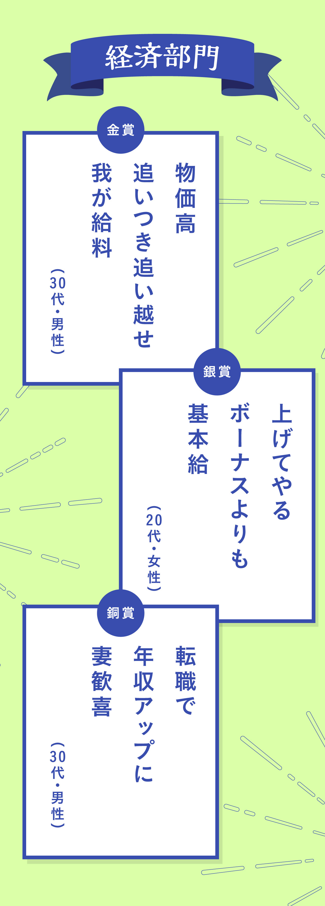 経済部門では「年収」や「賃金」「給与」をテーマにした句が選ばれました。