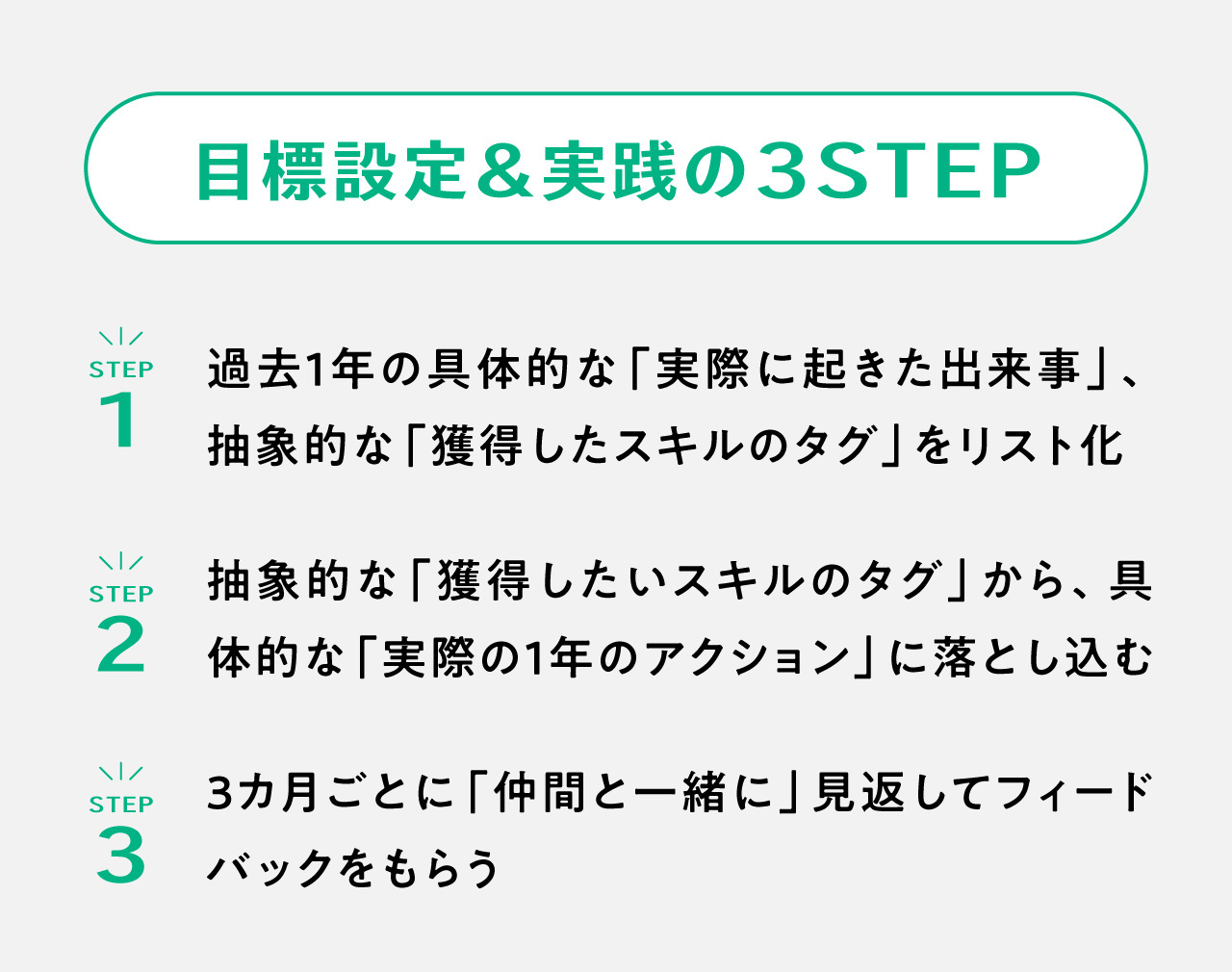 STEP2で立てた具体的なアクションに対して、3カ月から半年ごとに見返して、今の時点でできていること/できていないことを振り返ることで、短期的な次の一歩「ネクストアクション」が見えてきます。