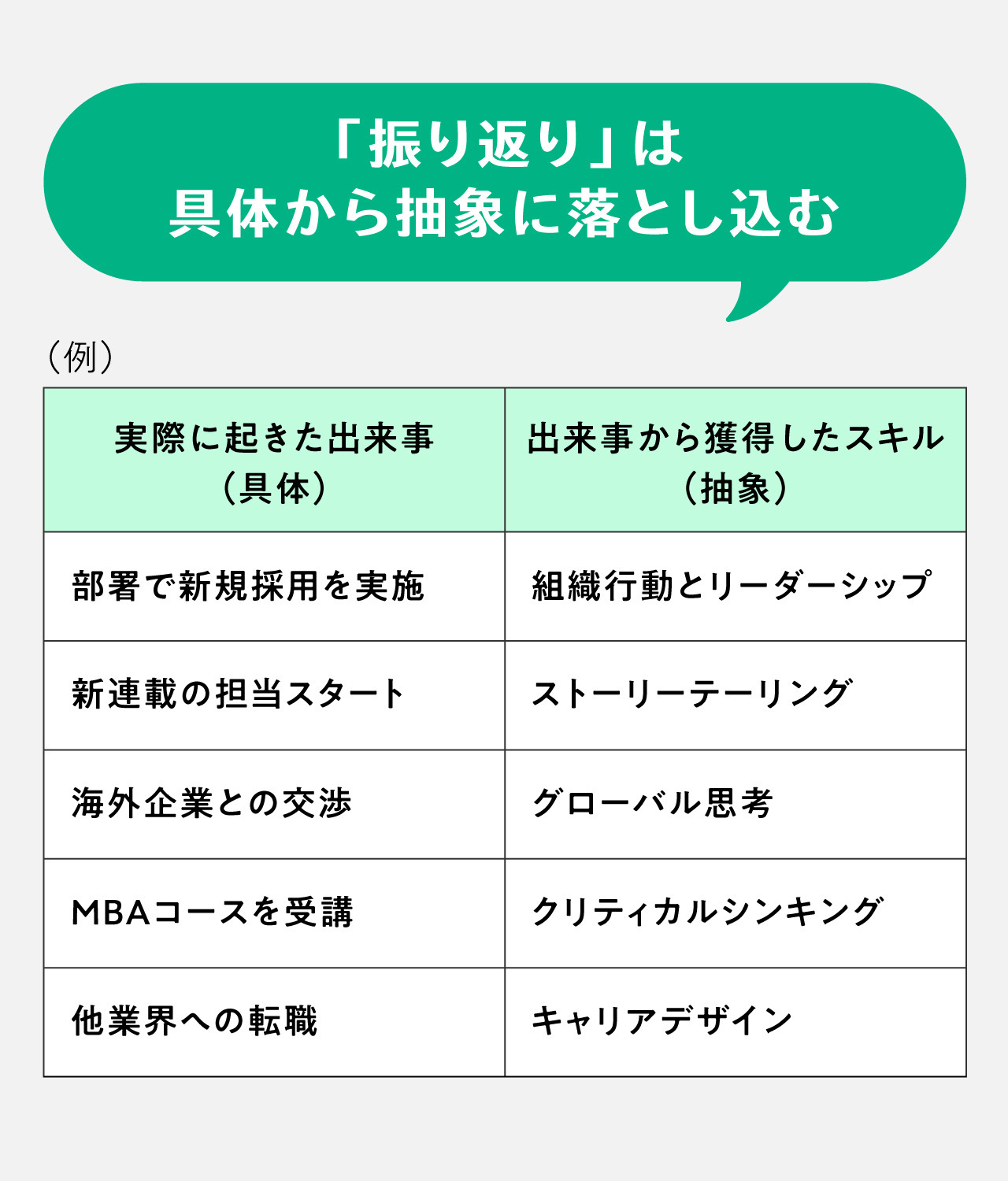 STEP1で【具体→抽象】の流れで過去の振り返りが終わったら、その逆の【抽象→具体】の流れで未来に対してのアクションへと落とし込んでいきます。