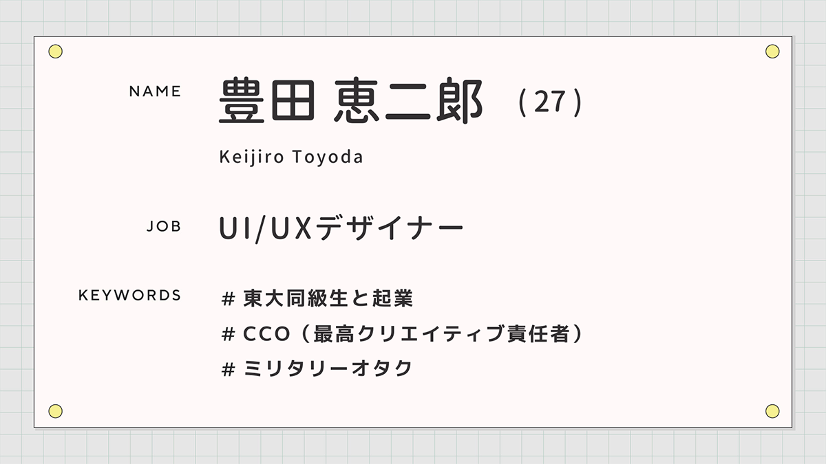 今回注目したジョブ(職)は「UI/UXデザイナー」。杉友さん(#11出演)のご紹介で、豊田さん(27)に話を聞きました。豊田さんは、東京大学時代の友人である井手康貴さんと開発エンジニアに向けたサイバーセキュリティ事業を展開するFlatt Securityを立ち上げました。