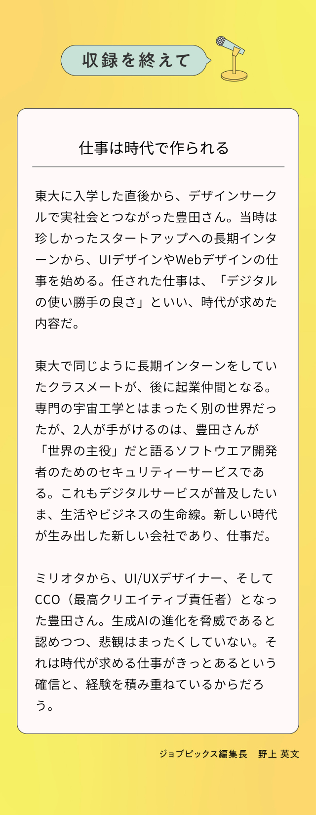 次回は、豊田さんのご友人で、Z世代クリエイターが集まるクリエイティブスタジオhicardで働く上江田楓さんへのインタビューを公開予定です。