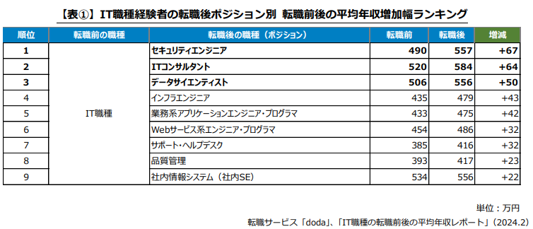 ポジション別で見ると、IT職種経験者が転職してセキュリティエンジニアになった場合、転職前の490万円から557万円にアップ。増加幅は67万円で他職種と比べて最大となりました。