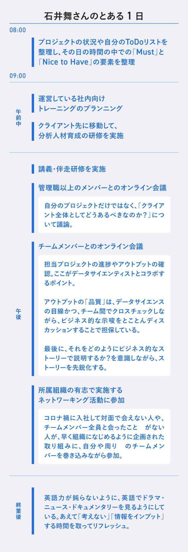 ちなみに今の仕事では、クライアント内で効果的にデータ分析を業務の意思決定の一部として活用する体制が整っていないケースが多いので、アナリティクスを組織としてどう生かすか? まで踏み込む場合は、経営陣と直接やり取りすることもあります。