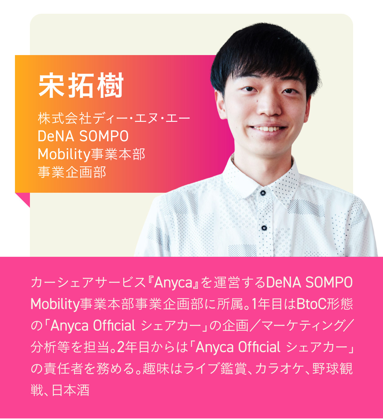 宋:僕が所属するカーシェア事業を展開する『DeNA SOMPO Mobility』も、取り組みたいことが山積しているので、それを一緒に実現してくれる仲間がこれから増えたらいいなと思っています。