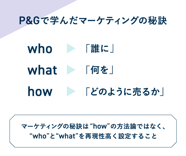 P&G出身の人材の価値が高い理由は、それを本当の意味で理解していて、再現性高く“who”と“what”を設定できるからだと思います。