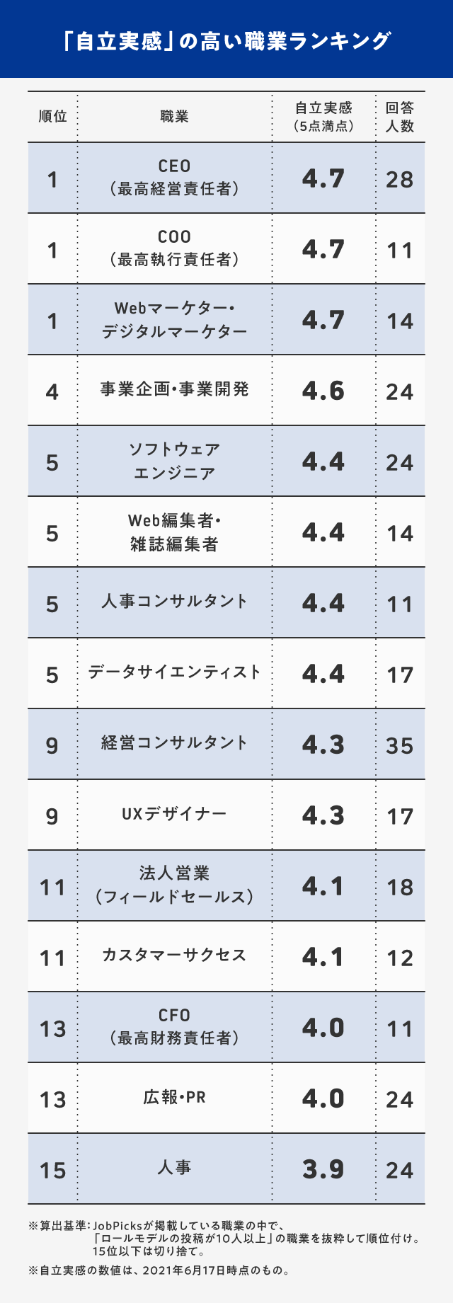 中でも自立実感が高い職業をピックアップしたところ、次のような結果となった。