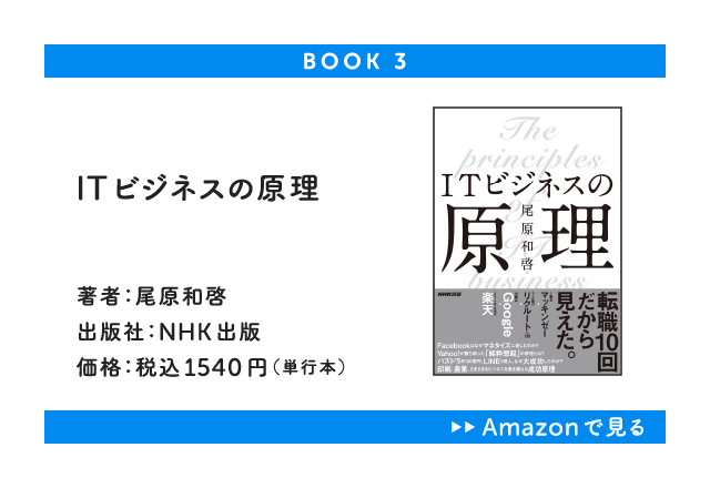 1冊目は、『ITビジネスの原理』(NHK出版)です。この本には、ネットビジネスの基礎を学びました。