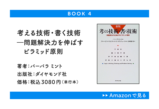 そこで、私がチームメンバーにも薦めている本が『考える技術・書く技術―問題解決力を伸ばすピラミッド原則』(ダイヤモンド社)です。