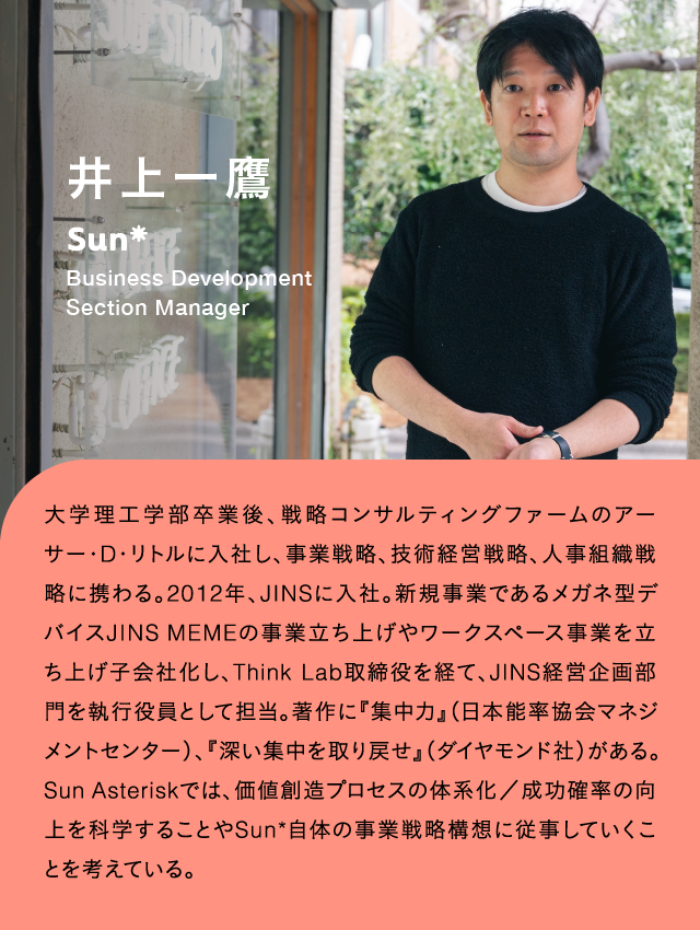 28歳の時に、5年間在籍したアーサー・D・リトルを退職し、メガネ屋のJINSに転職しました。約10年間在籍し、「JINS MEME」「Think Lab」という、2つの新規事業立ち上げを経験しました。
