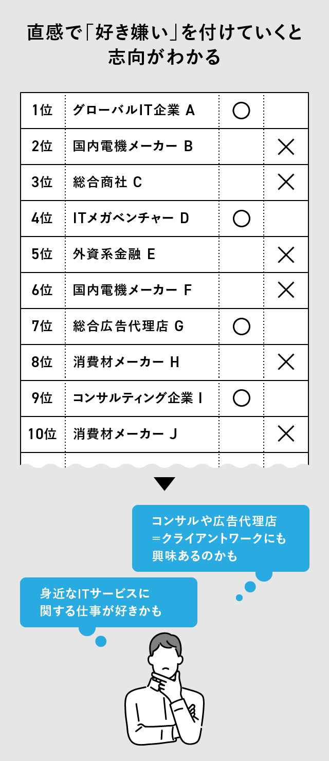 どの業界の仕事なら興味を持てそうか? を直感で取捨選択していくと、自分自身の志向を知ることにもつながるからだ。