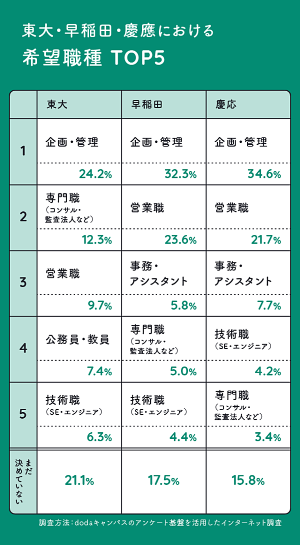 下の表は、関東圏の有名大学の代表格である東京大学と早稲田大学・慶應義塾大学の学生が就職で希望する職種TOP5だ。