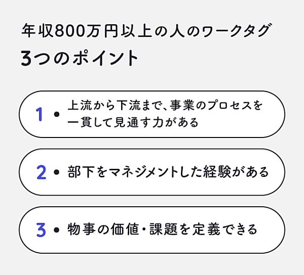 これを、【戦略】【策定】【部下】【推進】など、年収800万円以上の人が持つ「ワークタグ」を通じて分析すると、高給と言われる業種に就職しても、その後の市場価値に差が出ることが分かった。