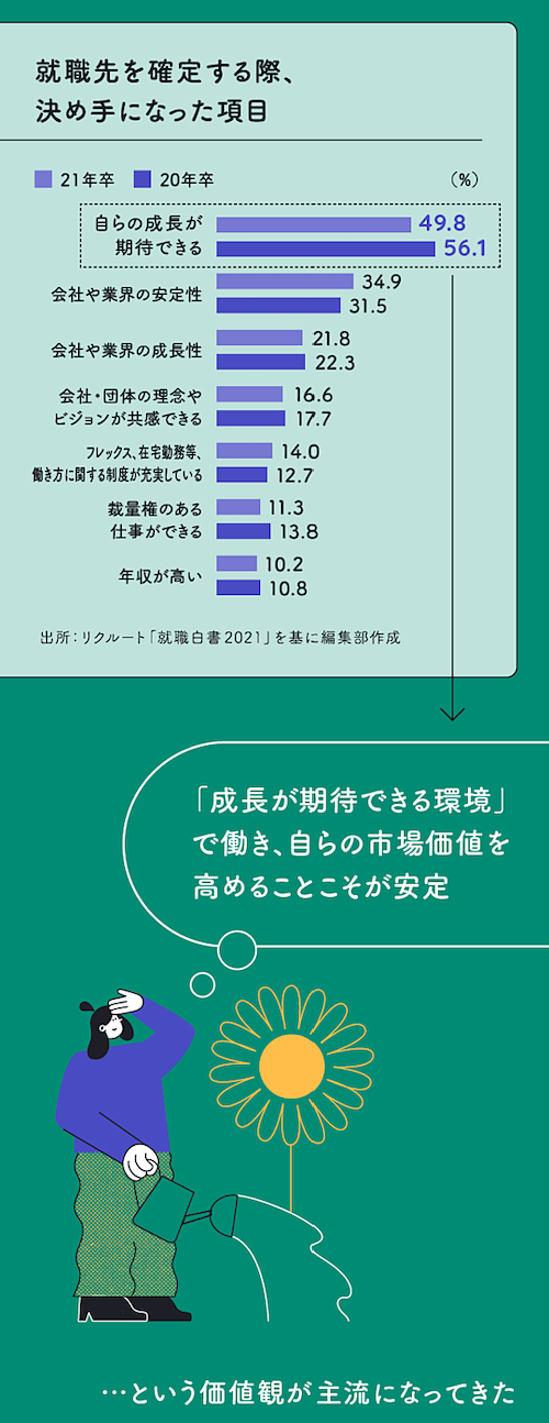 リクルート「就職白書2021」によると、21年卒の学生が就職先を確定する際の決め手にした項目第1位は、「自らの成長が期待できる」(49.8%)という理由だった。