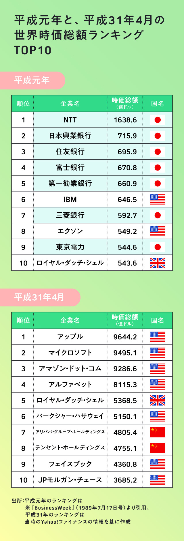 あれを見た人は覚えているかもしれませんが、平成元年は日本の時価総額トップ企業が軒並み世界の上位に入っていました。