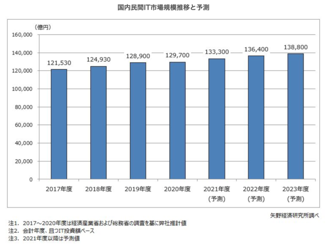 矢野経済研究所が発表した調査結果では、2020年度の国内IT市場規模は前年度比0.6%増の12兆9700億円。今後の予測値も伸びている。