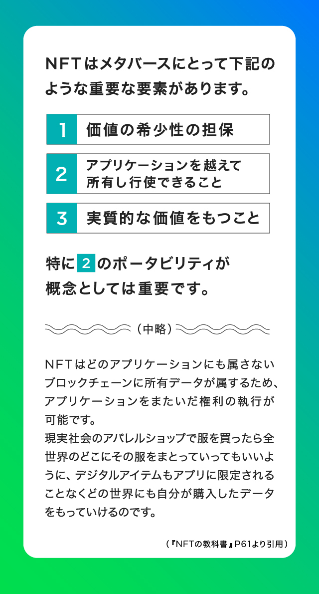 『NFTの教科書』の1章「NFTビジネスの全体像」の中で、NFT×メタバースのパートを執筆した福永尚爾さん(BeyondConcept代表)は、次のように解説しています。