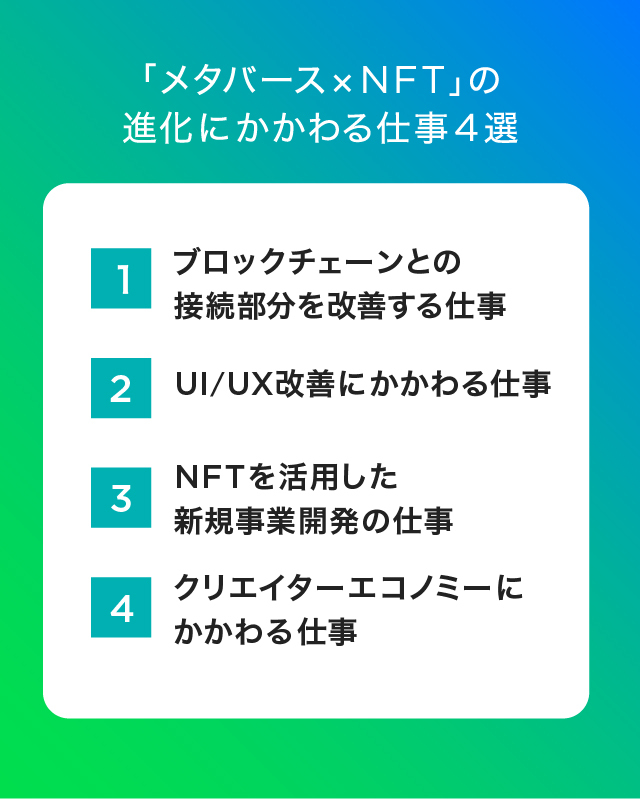 これらを踏まえて、私はメタバース×NFTに関する職業の中でも、次の4つにかかわる仕事に注目しています。
