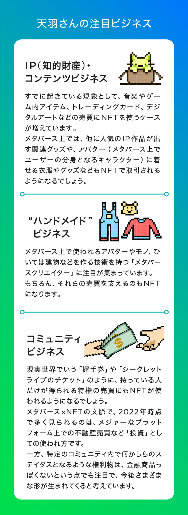 「メタバースはいわば次世代のSNS。なので、ユーザー同士が交流するだけならNFTは不要です。ただし、メタバースの中で経済活動を行う時や、複数の異なるメタバース間でモノやサービスの権利を移転する場合は、改ざんできない特徴を持つNFTを使ったほうが効率的にできる可能性があります」