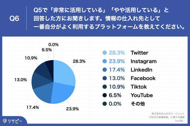 中でもTwitter、Instagram、LinkedInが上位を占め、求人サイトや転職エージェント以外で情報を集める人が増えているとうかがえる。