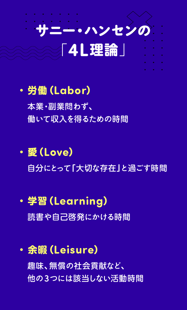 佐藤 キャリア形成をカジュアルに考えるきっかけとして、キャリア開発とライフ・プランニングを融合させた「統合的生涯設計理論」で知られるミネソタ大学のサニー・ハンセン名誉教授が提唱する「4L理論」が役立ちそうです。