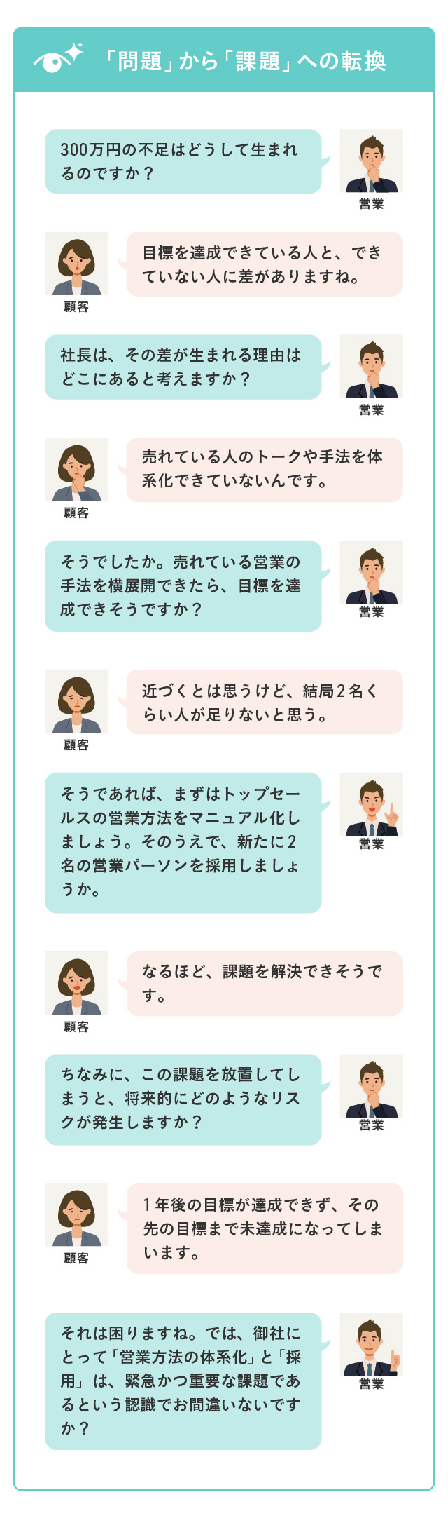 営業職がやるべきは、つまるところ「お客様の抱えている問題を課題に転換すること」です。