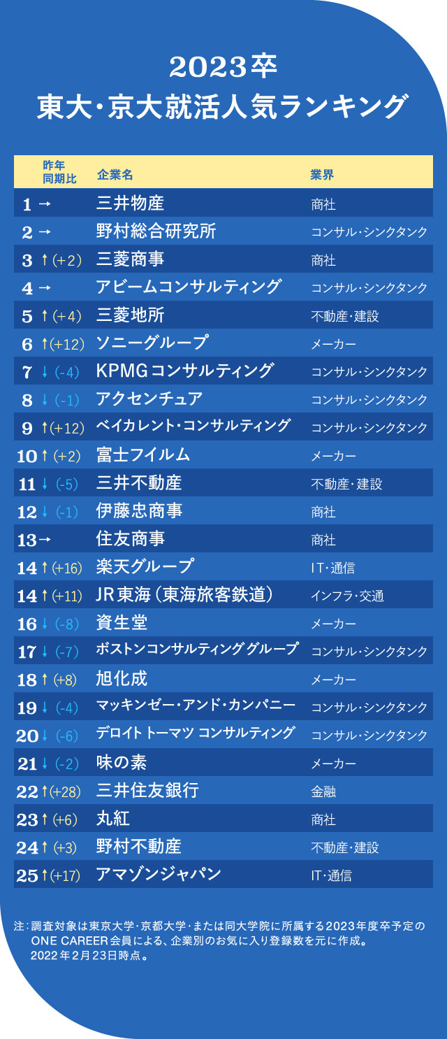 ワンキャリアの実施した東大・京大生を対象にした23卒の就活人気ランキングでも、5大商社は上位に君臨している。