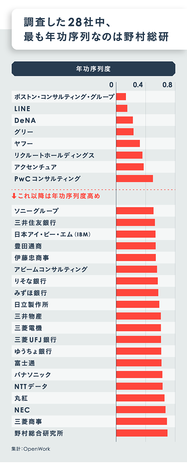 そこで、NewsPicksの過去記事に掲載された、OpenWorkの年功序列度のグラフを見てみよう。